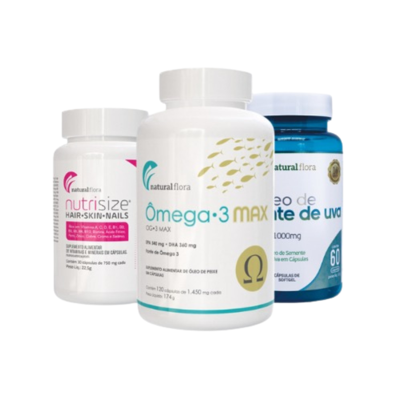 Este combo reúne o melhor da Natural Flora para nutrir seu corpo de dentro para fora. O Ômega 3 com selo MEG-3 fortalece o coração e a mente, o Óleo de Semente de Uva protege a pele e combate o envelhecimento, e o Nutrisize Woman potencializa a saúde de cabelos, unhas e bem-estar feminino. Juntos, eles oferecem suporte integral para uma vida mais equilibrada e radiante. Esqueça soluções parciais. Este trio entrega saúde, beleza e energia com ciência e qualidade.